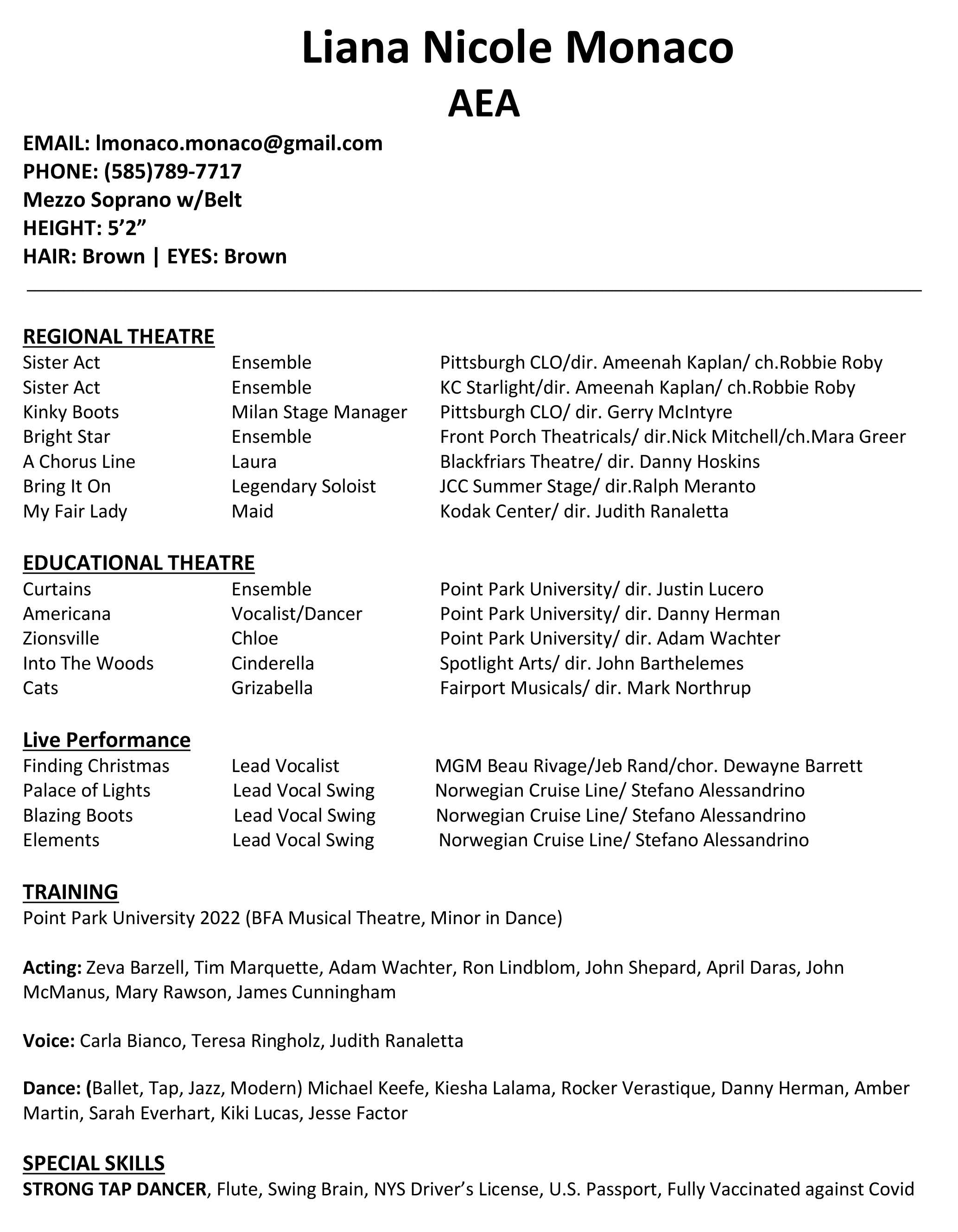 Liana Nicole Monaco is a New York City based Singer, Dancer and Actor that hails from Fairport, New York. She has been performing her entire life from kick, ball changing in the womb, a dramatic rendition of “The Impossible Dream” in her 3rd grade talent show, to local and regional stages as a musical theater actor, competitive dancer and tap soloist.